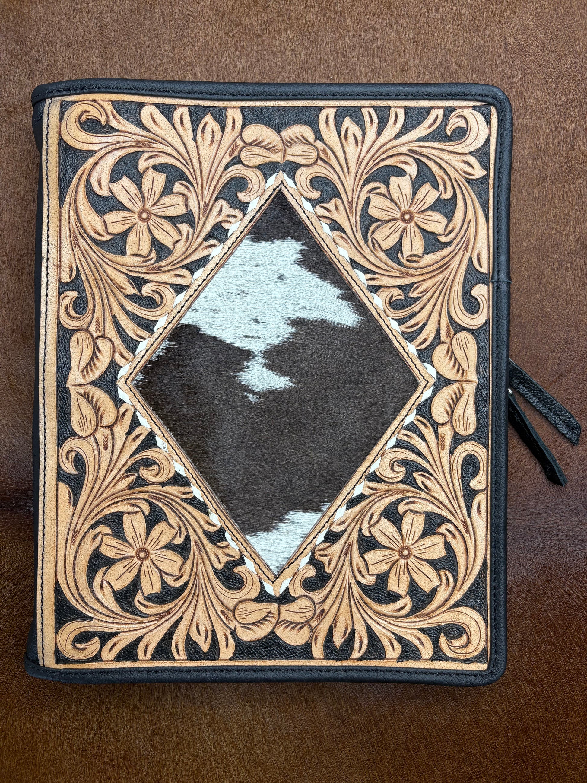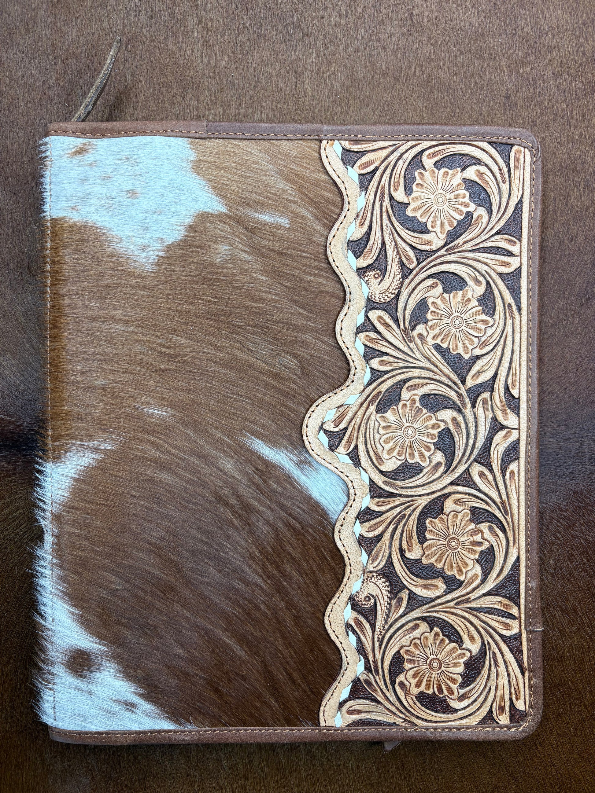 Bring rustic class to your workday with this handcrafted Cowhide & Leather Portfolio. Made from genuine hair-on cowhide with detailed hand-tooled leather panels, each piece is one-of-a-kind and built to last.