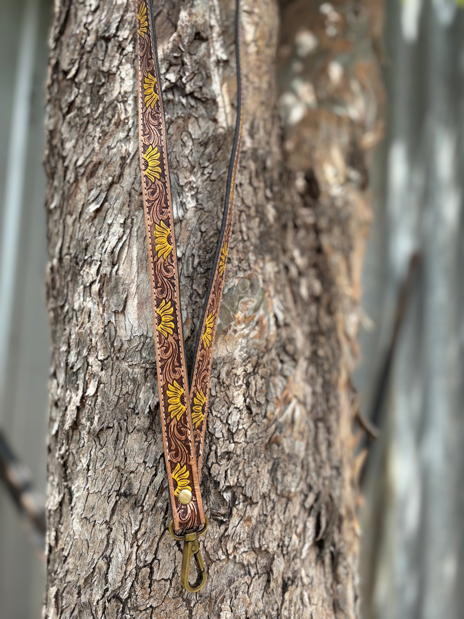 A beautifully tooled sunflower lanyard featuring golden blooms on brown leather. Bright, cheerful and authentically Western.