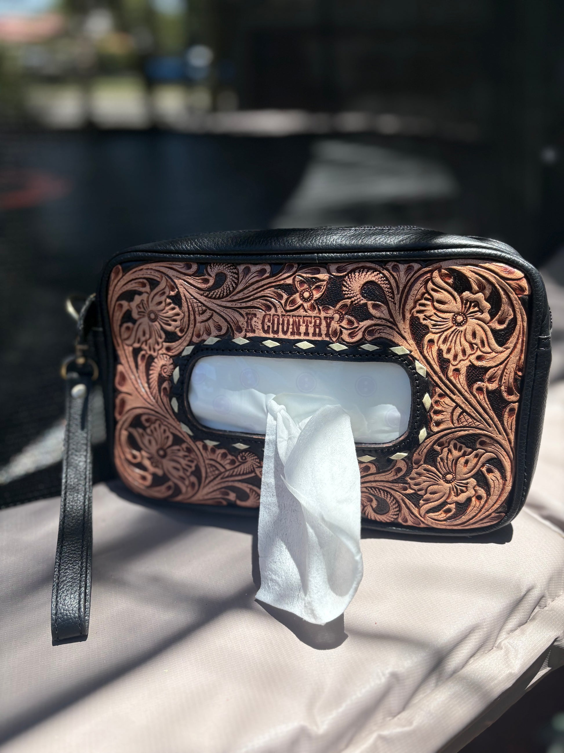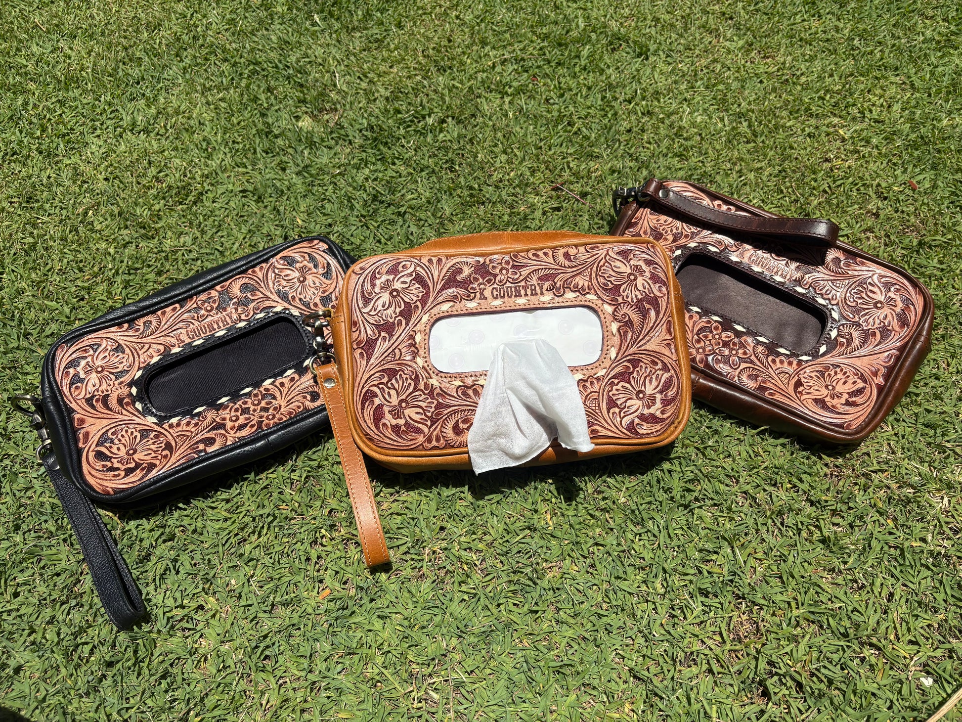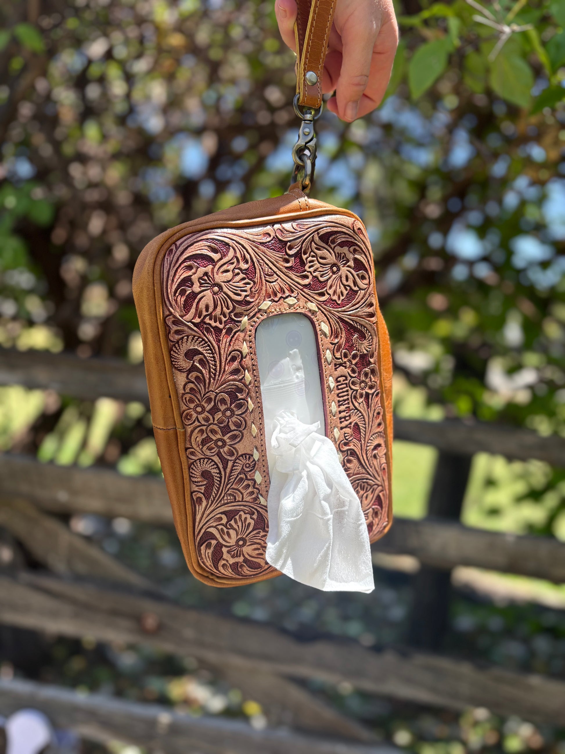 Crafted with premium genuine leather and finished with hand-tooled Western floral engraving, this wipe carrier brings a touch of outback class to everyday life on the go.