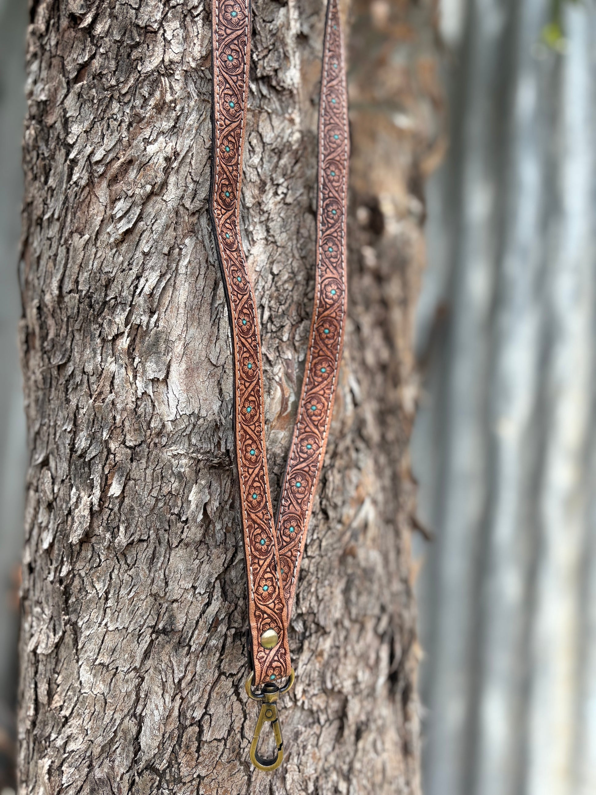 A beautifully tooled Western lanyard featuring delicate floral detailing with turquoise touches, perfect for the cowgirl who loves a hint of colour and a whole lot of country charm. Durable, lightweight and finished with rustic hardware for everyday use.