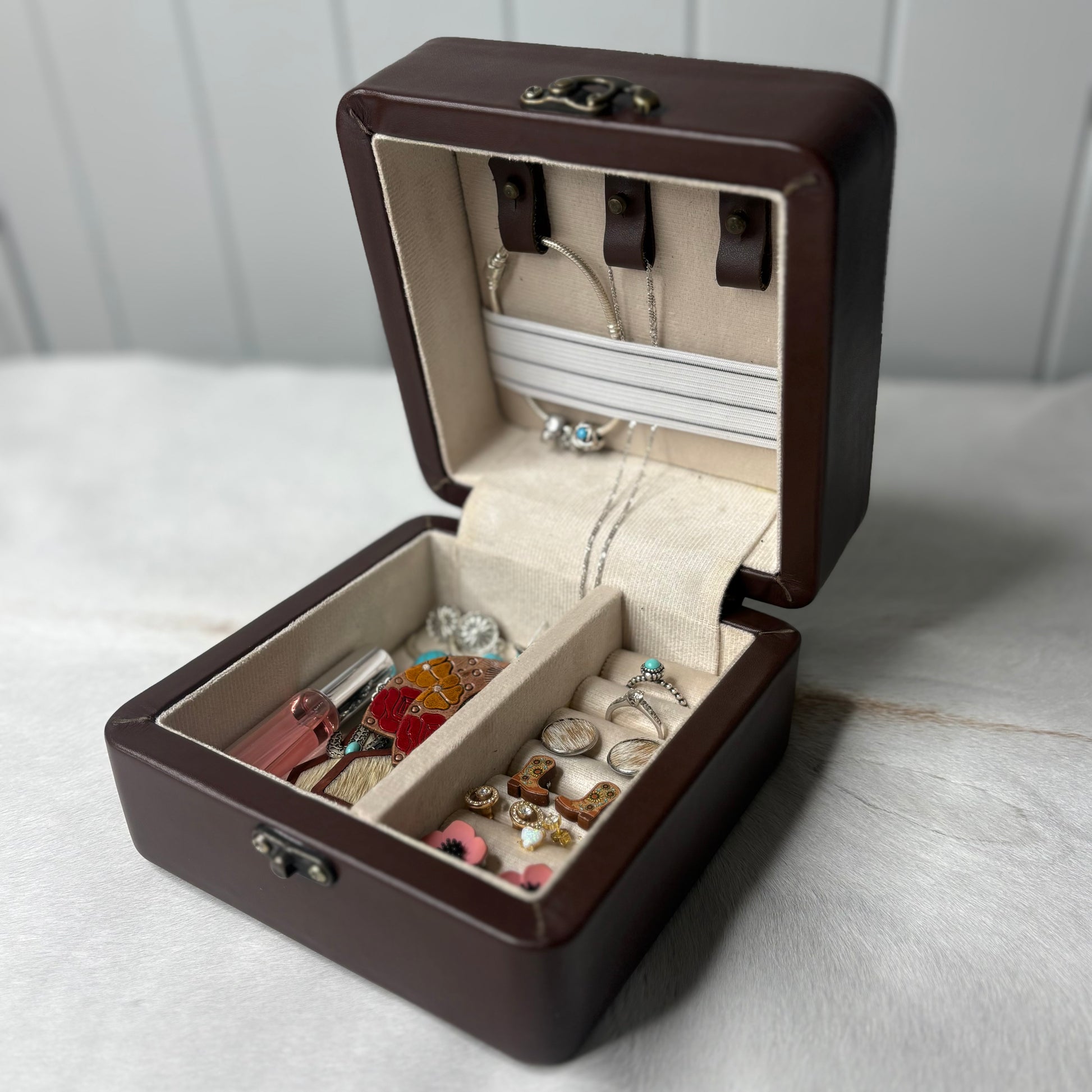 Crafted in rich leather and finished with a genuine cowhide lid, the Heirloom Jewellery Case blends country elegance with thoughtful functionality. Inside, soft linen lining, ring rolls, necklace hooks, and divided compartments keep your jewellery beautifully organised whether at home or on the road.
