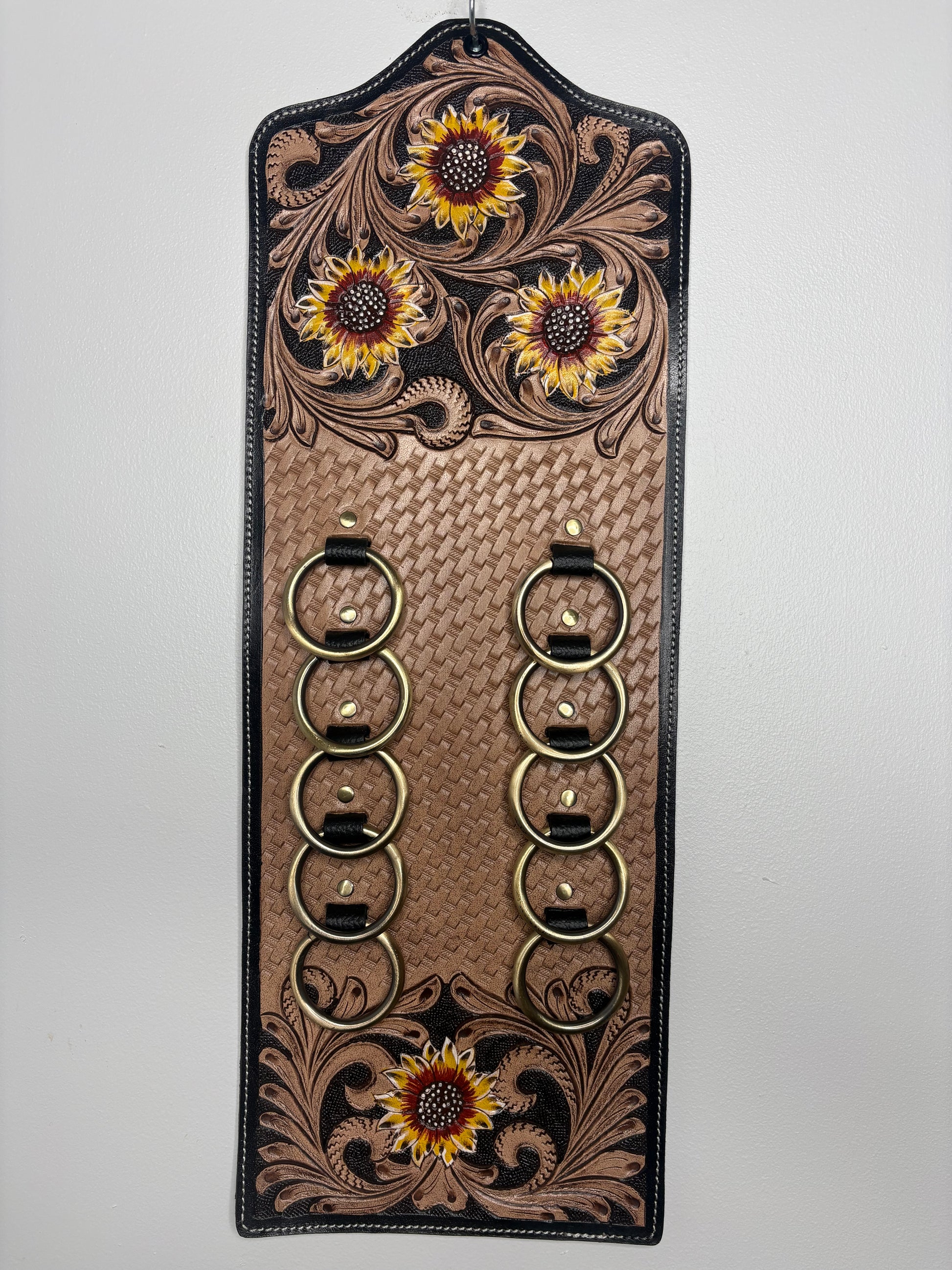 Each holder features intricate sunflower tooling, basket-weave leather design and sturdy brass rings, blending western craftsmanship with practical storage.